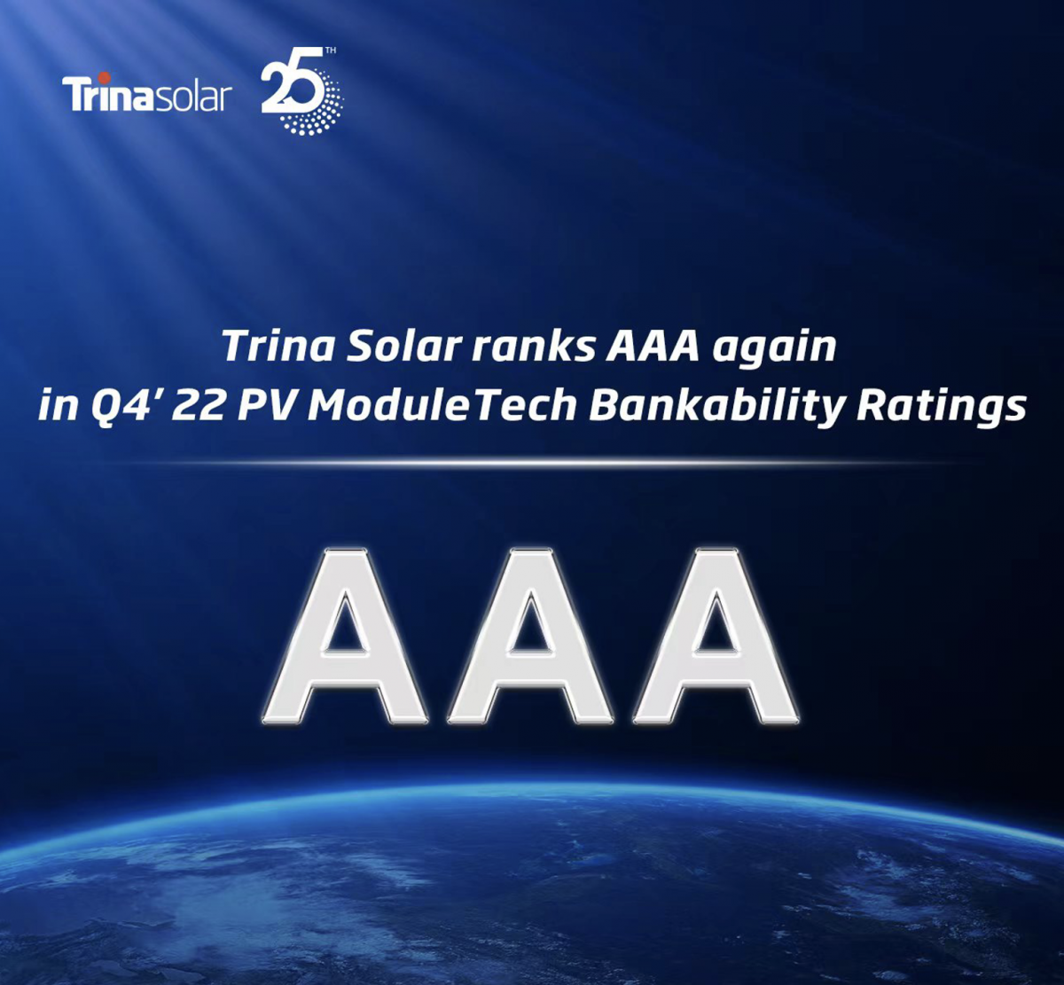 Trina Solar has maintained its AAA status for the third consecutive quarter in the PV ModuleTech bankability rankings released by PV Tech for Q4 2022.