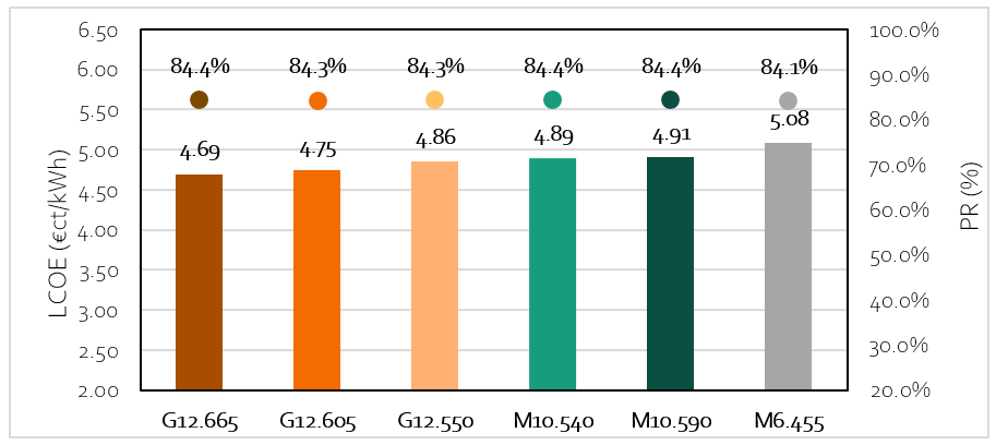 The Vertex G12 modules have the best CAPEX and LCOE. Compared to the M10 modules, the G12 600W and 670W modules perform particularly well, reducing CAPEX by up to 1.5-2 €cWp and LCOE by up to 3-4.5%. Compared to the M6 modules, the LCOE could be reduced by 6.5%-7.4%.