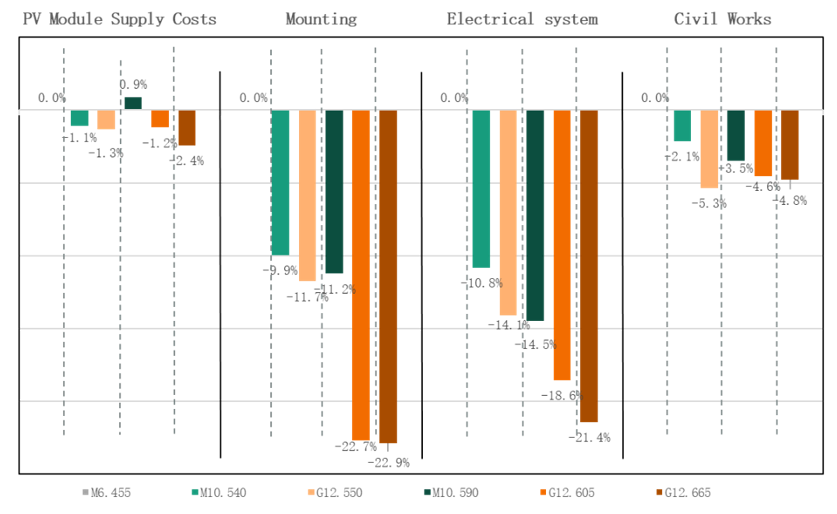 Results: The new generation of high-power modules performs better than the M6 modules in both CAPEX and LCOE; G12 performs better than M10, and M10 performs better than M6. In particular, the costs of trackers and electrical systems of M10 and G12 are significantly lower than other modules.