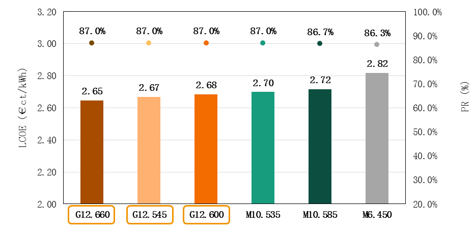 The Vertex G12 modules have the best CAPEX and LCOE. Compared to the M10 modules, the G12 660W and 545W reduce CAPEX by up to 0.81-1.21 €cWp and LCOE by up to 1.8-2.6%. Compared to the 450W M6 modules, the CAPEX can be reduced by 2.39-2.79 €cWp and the LCOE 5.3%-6.0%.