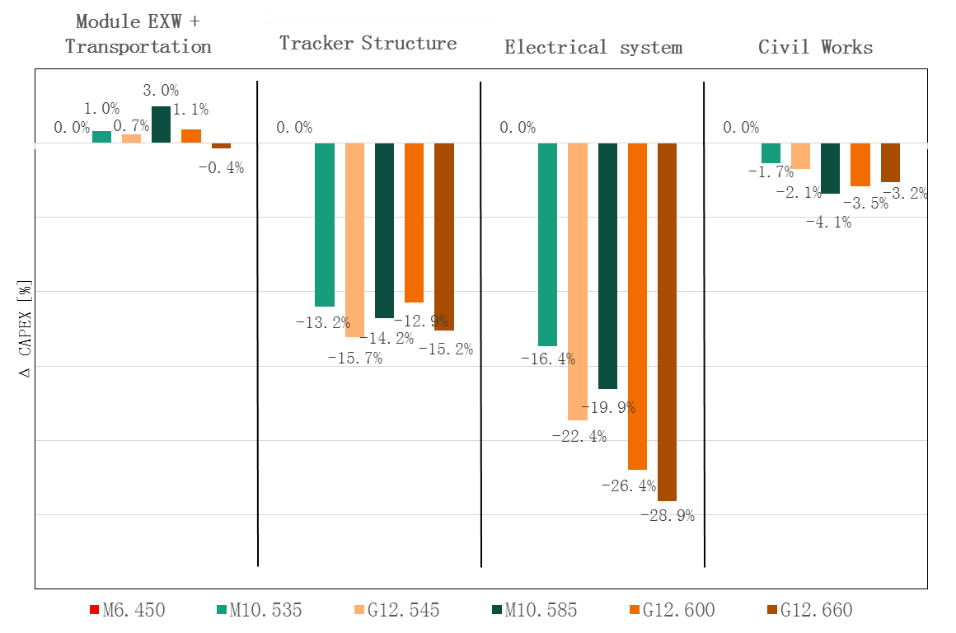 It also found that among the G12 bifacial modules represented by Trina Solar’s Vertex series, the 545W, 600W and 660W modules are superior to the M10 bifacial modules in both CAPEX and LCOE.