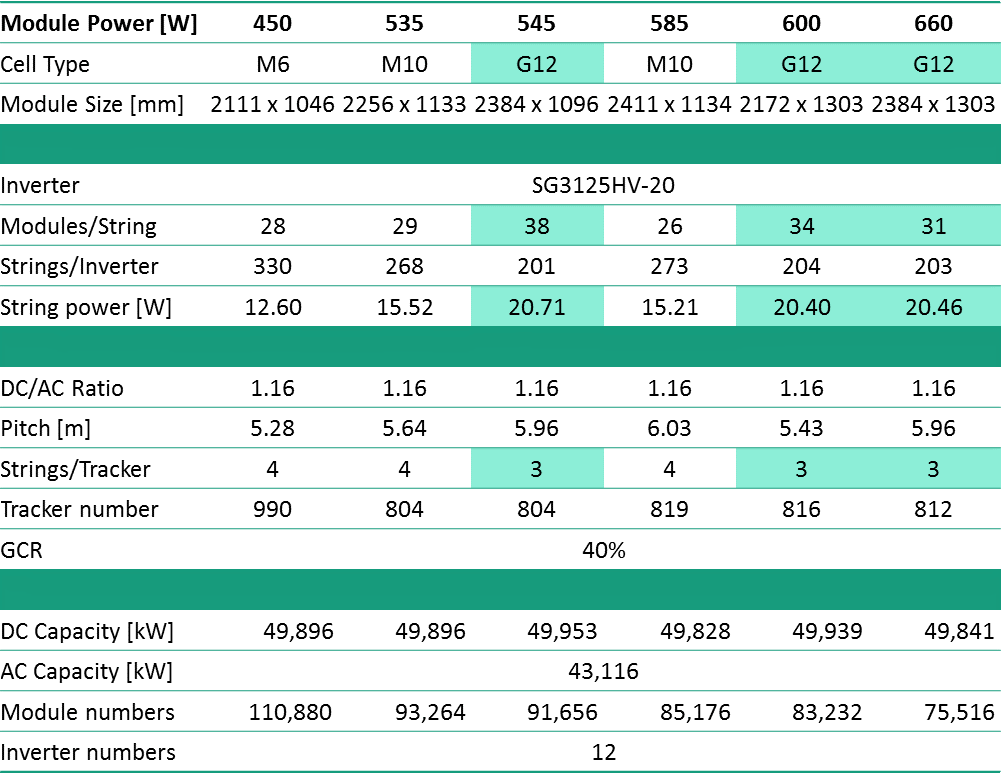 Module types: M6 bifacial 450W modules; M10 bifacial 535W modules and 585W modules; G12 bifacial 545W, 600W and 660W modules